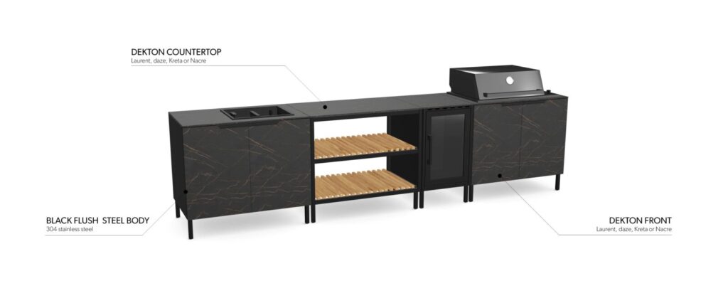 - Trwałość outdoor – materiały stworzone do ekspozycji na zewnątrz (stal nierdzewna + powierzchnie Dekton w wybranych wykończeniach).
