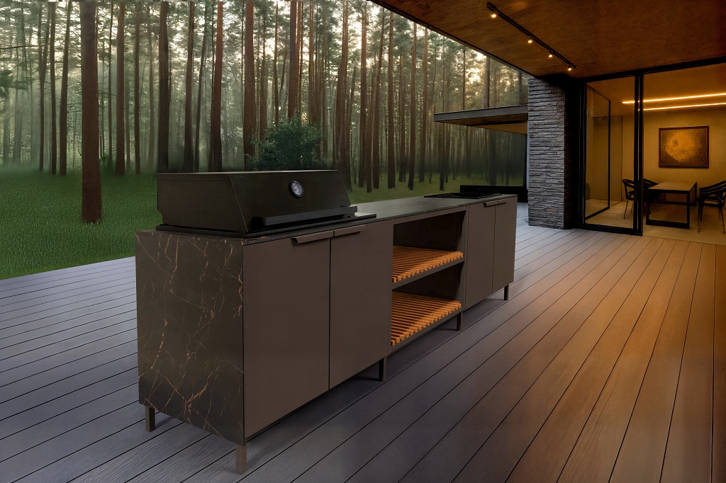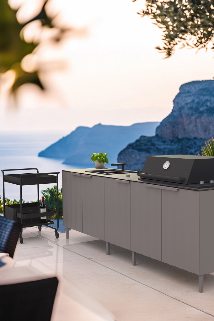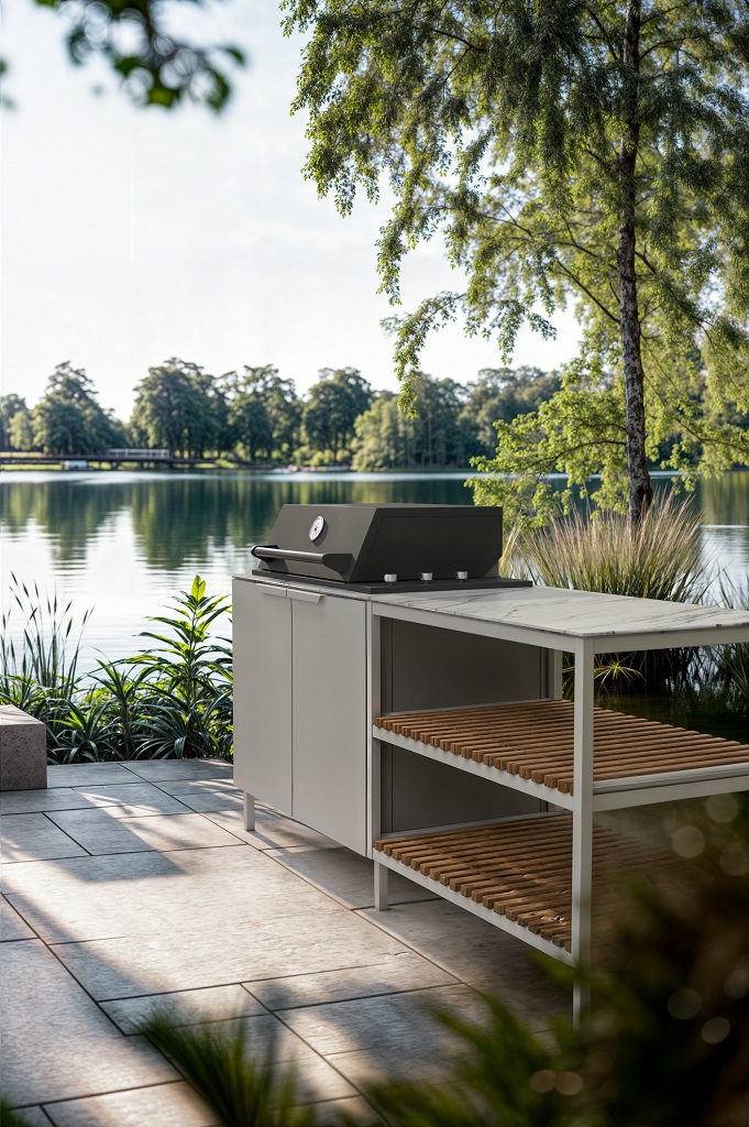 Kolekcja Line wykorzystuje stal nierdzewną 304 z matowym wykończeniem proszkowym – połączenie wybrane ze względu na trwałość, odporność na korozję i estetyczny wygląd. Materiał ten został zaprojektowany tak, aby wytrzymywał działanie deszczu, światła słonecznego i zmian temperatury, nie rdzewiejąc ani nie blaknąc, co czyni go idealnym wyborem do kuchni zewnętrznych, które muszą działać przez cały rok.